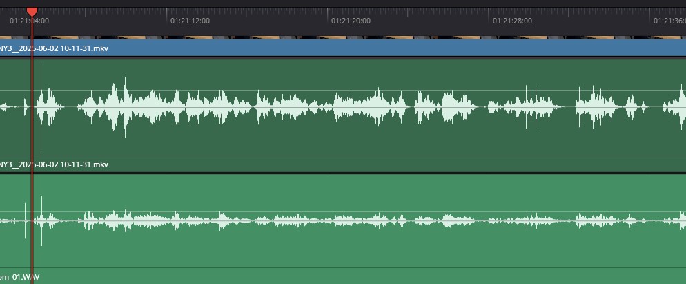 - Manually synchronize them by dragging the files (and progressively zooming to the maximum possible zoom, because for sound, even some frames of difference are easy to detect)