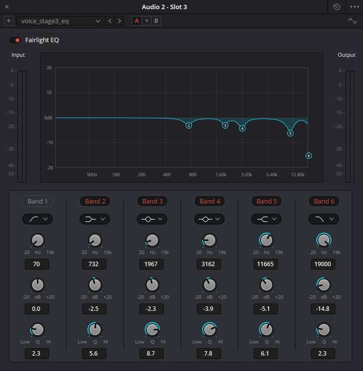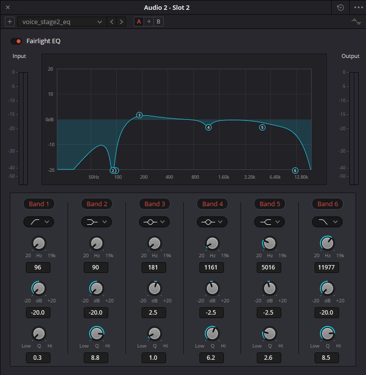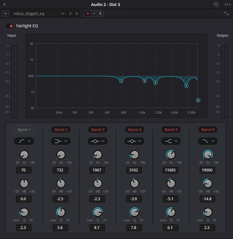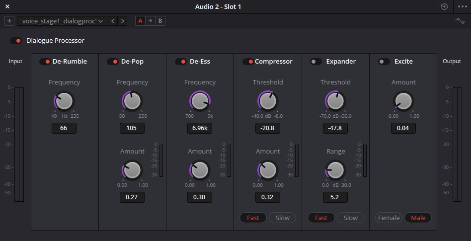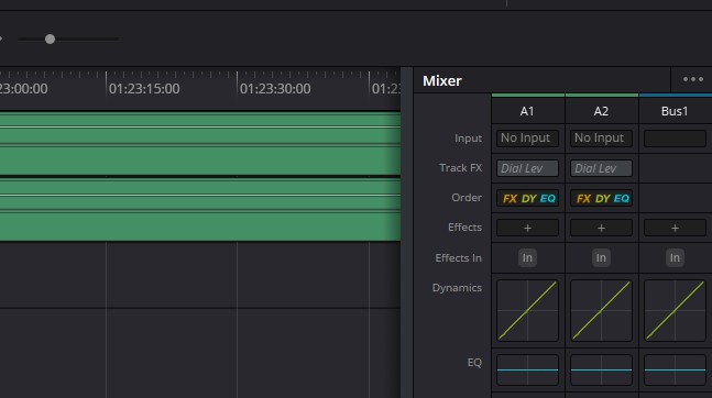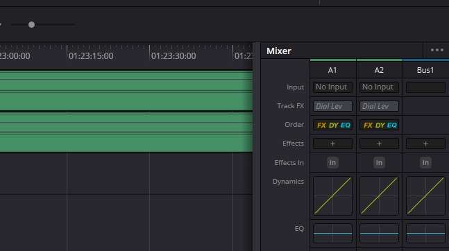 - For all the audio track you’ve kept, in the fairlight tab, go to the mixer (bottom-right corner) and in the “track FX” zone, add 4 effects : dialogue processor, fairlight EQ, another fairlight EQ, Gain